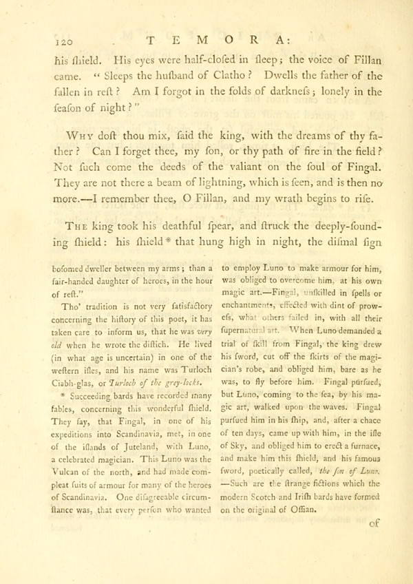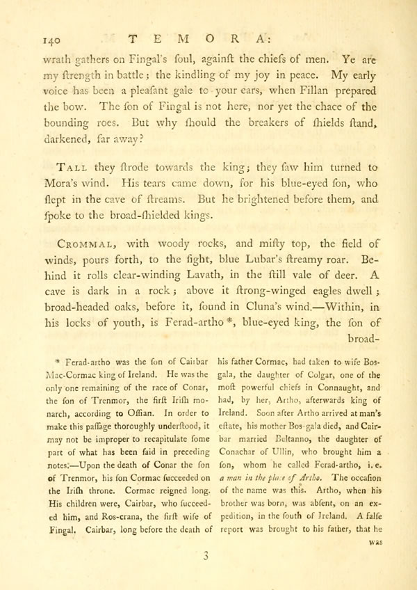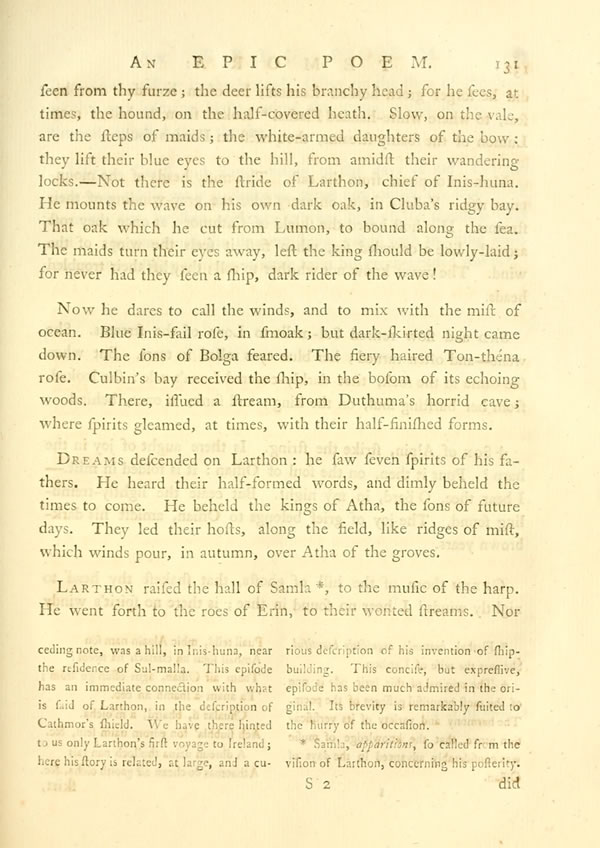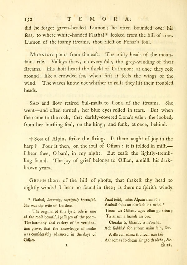 Larthon raised the hall of SamlaDisplay note, to the music of the harp. He went forth to the roes of Erin, to their wonted streams. Nor [ 132 ] View Page Image did he forget green-headed Lumon; he often bounded over his seas, to where white-handed FlathalDisplay note looked from the hill of roes. Lumon of the foamy streams, thou risest on Fonar's soul.
