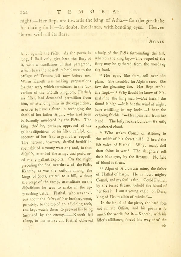 The night came rolling down. The light of an hundred oaks arose. Fingal sat beneath a tree. Old AlthanDisplay note stood in the midst. [ 18 ] View Page ImageHe told the tale of fallen Cormac. Althan the son of Conachar, the friend of car-borne Cuchullin: he dwelt with Cormac in windy Temora, when Semo's son fought with generous Torlath.—The tale of Althan was mournful, and the tear was in his eye.