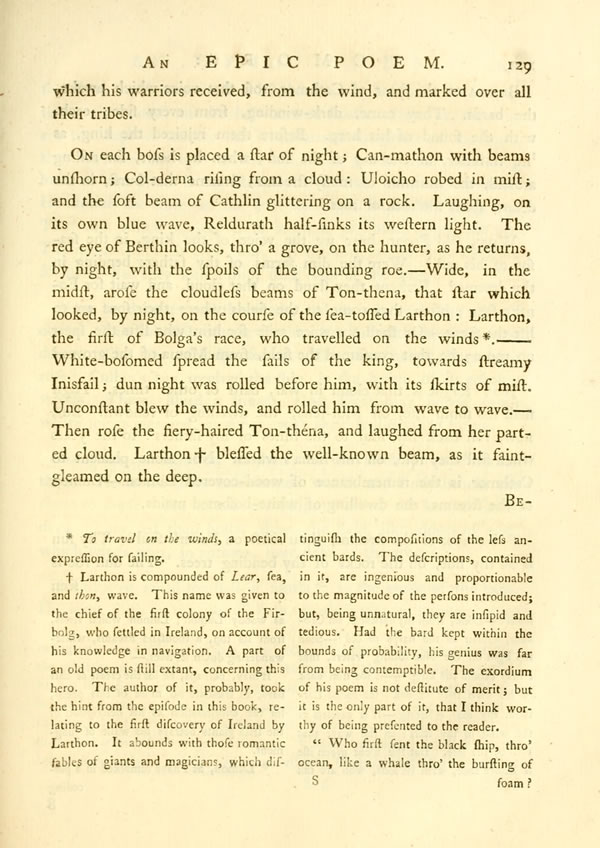 On each boss is placed a star of night; Can-mathon with beams unshorn; Col-derna rising from a cloud: Uloicho robed in mist; and the soft beam of Cathlin glittering on a rock. Laughing, on its own blue wave, Reldurath half-sinks its western light. The red eye of Berthin looks, thro' a grove, on the hunter, as he returns, by night, with the spoils of the bounding roe.—Wide, in the midst, arose the cloudless beams of Ton-thena, that star which looked, by night, on the course of the sea-tossed Larthon: Larthon, the first of Bolga's race, who travelled on the windsDisplay note.—— White-bosomed spread the sails of the king, towards streamy Inisfail; dun night was rolled before him, with its skirts of mist. Unconstant blew the winds, and rolled him from wave to wave.—Then rose the fiery-haired Ton-théna, and laughed from her parted cloud. LarthonDisplay note blessed the well-known beam, as it faint-gleamed on the deep.