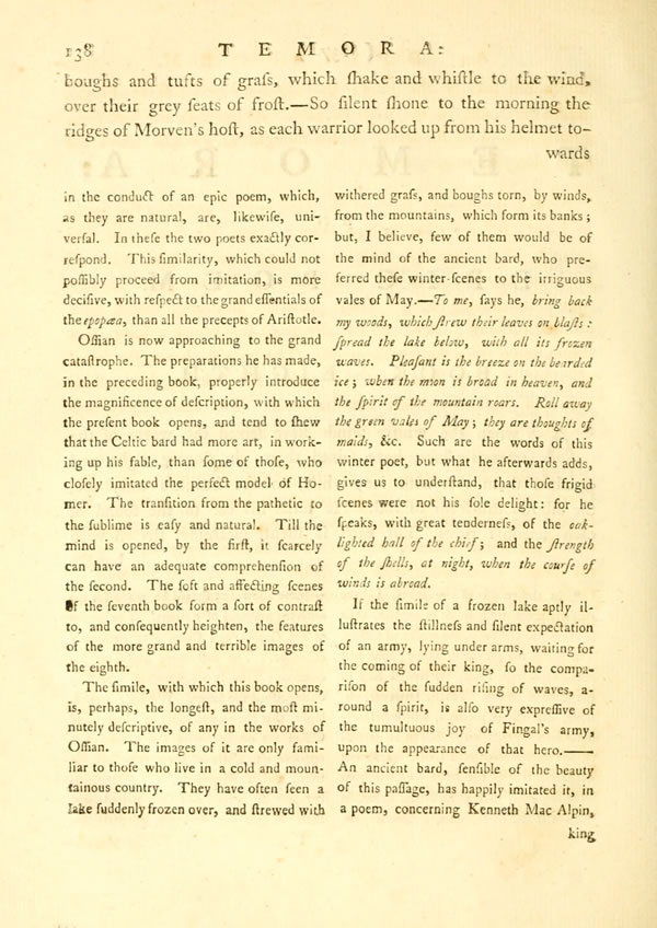 Display noteAs when the wintry winds have seized the waves of the mountain-lake, have seized them, in stormy night, and cloathed them over with ice; white, to the hunter’s early eye, the billows still seem to roll. He turns his ear to the sound of each unequal ridge. But each is silent, gleaming, strewn with [ 138 ] View Page Image boughs and tufts of grass, which shake and whistle to the wind, over their grey seats of frost.—So silent shone to the morning the ridges of Morven’s host, as each warrior looked up from his helmet towards [ 139 ] View Page Image the hill of the king; the cloud-covered hill of Fingal, where he strode, in the folds of mist. At times is the hero seen, greatly dim in all his arms. From thought to thought rolled the war, along his mighty soul.