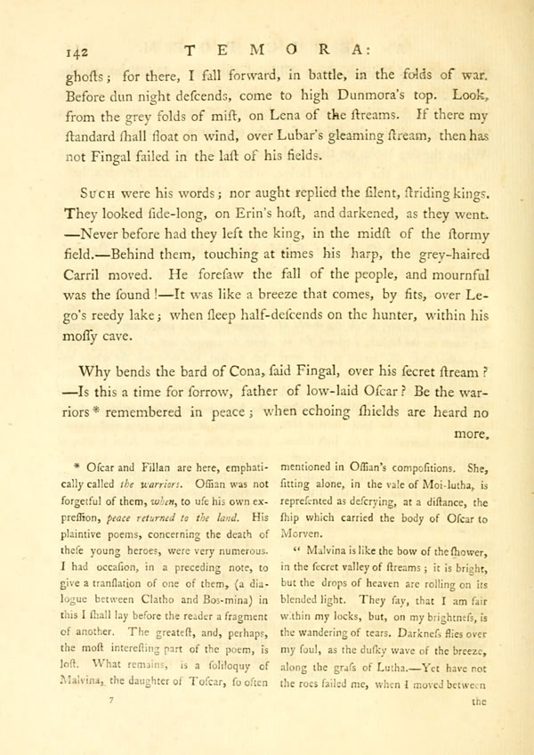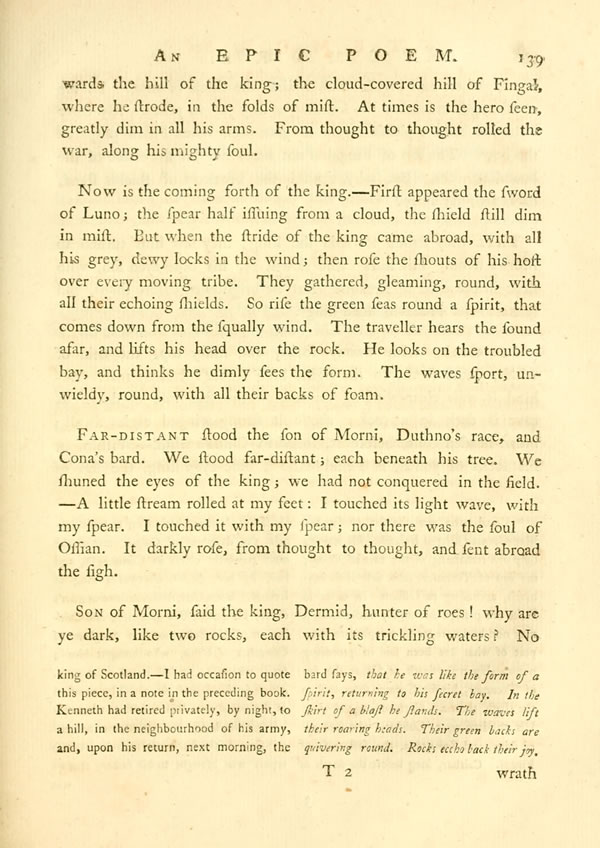 In peace he comes not, Cairbar. I have seen his forward spearDisplay note.It is a meteor of death: the blood of thousands is on its steel.—— He came first to the shore, strong in the grey hair of age. Full rose his sinewy limbs, as he strode in his might. That sword is by his side which gives no secondDisplay notewound. His shield is terrible, like the bloody moon ascending thro' a storm.—Then came Ossian king of songs; and Morni's son, the first of men. Connal leaps forward on his spear: Dermid spreads his dark-brown locks.—— Fillan bends his bow, the young hunter of streamy Moruth.Display note—But who is that before them, like the terrible course of a stream! It is the son of Ossian, bright between his locks. His long hair falls on his back.—His dark brows are half-inclosed in steel. His [ 7 ] View Page Imagesword hangs loose on his side. His spear glitters as he moves. I fled from his terrible eyes, king of high Temora!