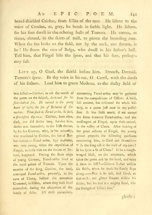 Crommal, with woody rocks, and misty top, the field of winds, pours forth, to the fight, blue Lubar’s streamy roar. Behind it rolls clear-winding Lavath, in the still vale of deer. A cave is dark in a rock; above it strong-winged eagles dwell; broad-headed oaks, before it, sound in Cluna’s wind.—Within, in his locks of youth, is Ferad-arthoDisplay note, blue-eyed king, the son of [ 141 ] View Page Image broad-shielded Cairbar, from Ullin of the roes. He listens to the voice of Condan, as, grey, he bends in feeble light. He listens, for his foes dwell in the echoing halls of Temora. He comes, at times, abroad, in the skirts of mist, to pierce the bounding roes. When the sun looks on the field, nor by the rock, nor stream, is he! He shuns the race of Bolga, who dwell in his father’s hall. Tell him, that Fingal lifts the spear, and that his foes, perhaps, may fail.