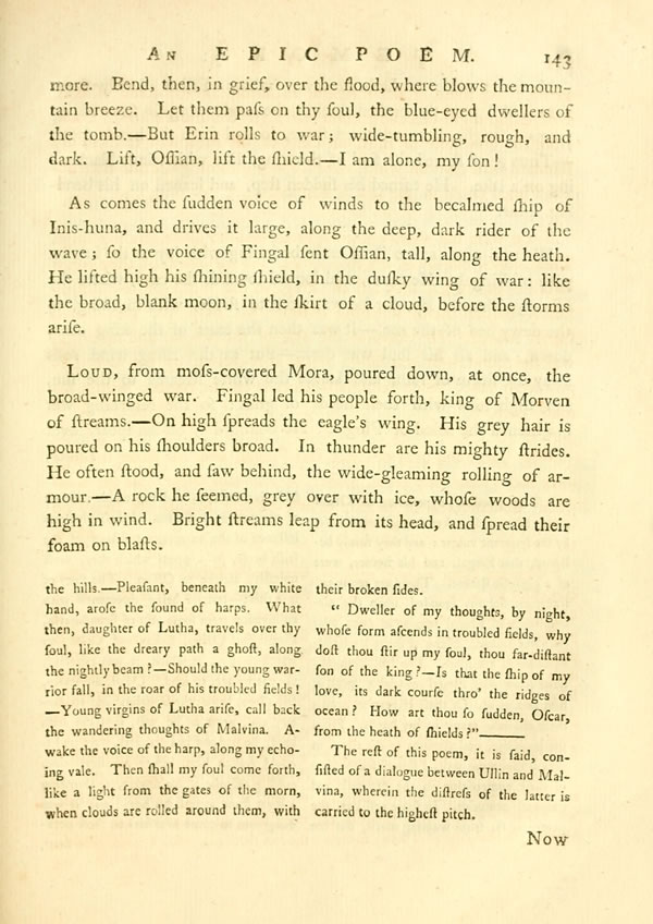Why bends the bard of Cona, said Fingal, over his secret stream?—Is this a time for sorrow, father of low-laid Oscar? Be the warriorsDisplay note remembered in peace; when echoing shields are heard no [ 143 ] View Page Image more. Bend, then, in grief, over the flood, where blows the mountain breeze. Let them pass on thy soul, the blue-eyed dwellers of the tomb.—But Erin rolls to war; wide-tumbling, rough, and dark. Lift, Ossian, lift the shield.—I am alone, my son!