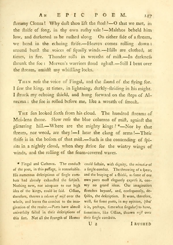 Maronnan fell, by Fingal, laid large across a stream. The waters gathered by his side, and leapt grey over his bossy shield.—Clonar is pierced by Cathmor: nor yet lay the chief on earth. An oak seized his hair in his fall. His helmet rolled on the ground. By its thong, hung his broad shield; over it wandered his streaming blood. Tla-minDisplay note shall weep, in the hall, and strike her heaving breast.