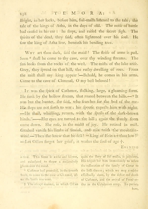 Why art thou dark, said the maid? The strife of arms is past. SoonDisplay note shall he come to thy cave, over thy winding streams. The sun looks from the rocks of the west. The mists of the lake arise. Grey, they spread on that hill, the rushy dwelling of roes. From the mist shall my king appear!—Behold, he comes in his arms. Come to the cave of Clonmal, O my best beloved!