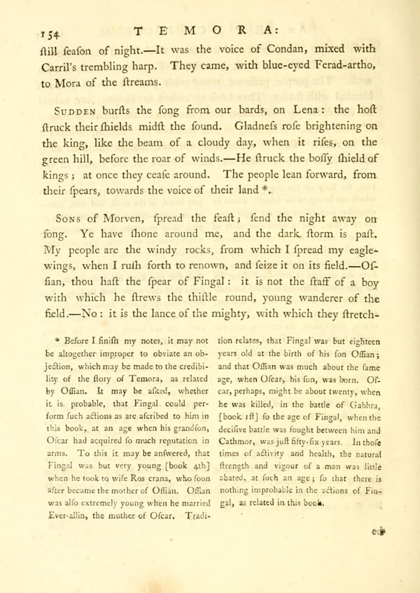 Sudden bursts the song from our bards, on Lena: the host struck their shields midst the sound. Gladness rose brightening on the king, like the beam of a cloudy day, when it rises, on the green hill, before the roar of winds.—He struck the bossy shield of kings; at once they cease around. The people lean forward, from their spears, towards the voice of their landDisplay note.