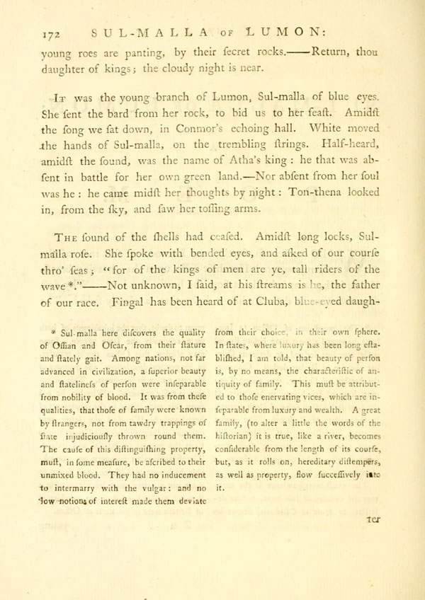It was the young branch of Lumon, Sul-malla of blue eyes. She sent the bard from her rock, to bid us to her feast. Amidst the song we sat down, in Conmor’s echoing hall. White moved the hands of Sul-malla, on the trembling strings. Half-heard, amidst the found, was the name of Atha’s king: he that was absent in battle for her own green land.—Nor absent from her soul was he: he came midst her thoughts by night: Ton-thena looked in, from the sky, and saw her tossing arms.