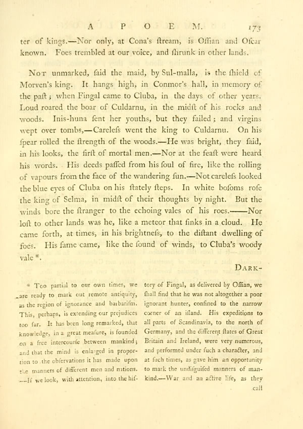 Not unmarked, said the maid, by Sul-malla, is the shield of Morven’s king. It hangs high, in Conmor’s hall, in memory of the past; when Fingal came to Cluba, in the days of other years. Loud roared the boar of Culdarnu, in the midst of his rocks and woods. Inis-huna sent her youths, but they failed; and virgins wept over tombs,—Careless went the king to Culdarnu. On his spear rolled the strength of the woods.—He was bright, they said, in his looks, the first of mortal men.—Nor at the feast were heard his words. His deeds passed from his soul of fire, like the rolling of vapours from the face of the wandering sun.—Not careless looked the blue eyes of Cluba on his stately steps. In white bosoms rose the king of Selma, in midst of their thoughts by night. But the winds bore the stranger to the echoing vales of his roes.——Nor lost to other lands was he, like a meteor that sinks in a cloud. He came forth, at times, in his brightness, to the distant dwelling of foes. His fame came, like the sound of winds, to Cluba’s woody valeDisplay note