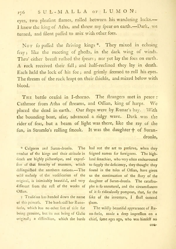 In armour came a stately form: I mixed my strokes with the king. By turns our shields are pierced: loud rung our steely mails. His helmet fell to the ground. In brightness shone the foe. His [ 176 ] View Page Image eyes, two pleasant flames, rolled between his wandering locks.—I knew the king of Atha, and threw my spear on earth.—Dark, we turned, and silent passed to mix with other foes.