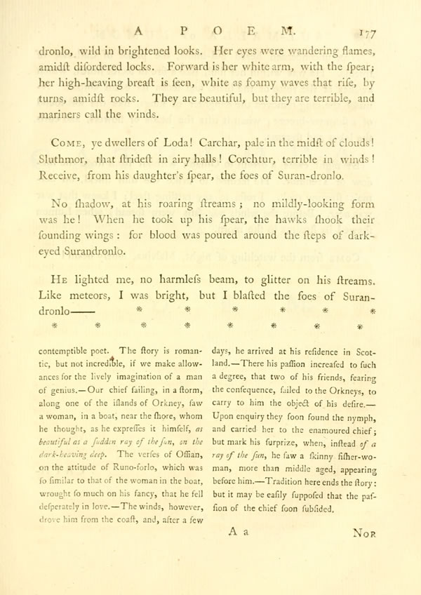 The battle ceased in I-thorno. The strangers met in peace: Cathmor from Atha of streams, and Ossian, king of harps. We placed the dead in earth. Our steps were by Runar’s bay. With the bounding boat, afar, advanced a ridgy wave. Dark was the rider of seas, but a beam of light was there, like the ray of the sun, in Stromlo’s rolling smoak. It was the daughterDisplay note of Suran-dronlo, [ 177 ] View Page Image wild in brightened looks. Her eyes were wandering flames, amidst disordered locks. Forward is her white arm, with the spear; her high-heaving breast is seen, white as foamy waves that rise, by turns, amidst rocks. They are beautiful, but they are terrible, and mariners call the winds.