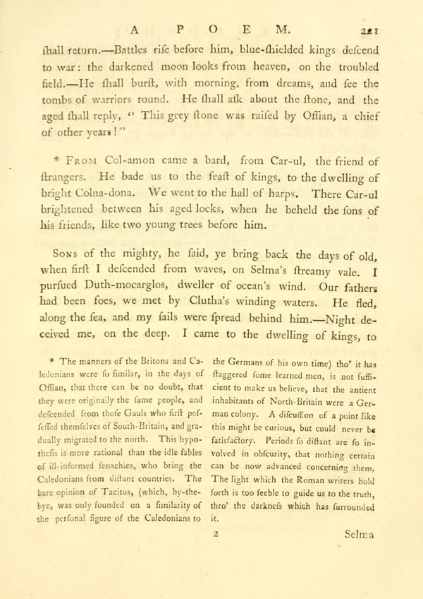 Display noteFrom Col-amon came a bard, from Car-ul, the friend of strangers. He bade us to the feast of kings, to the dwelling of bright Colna-dona. We went to the hall of harps. There Car-ul brightened between his aged locks, when he beheld the sons of his friends, like two young trees before him.