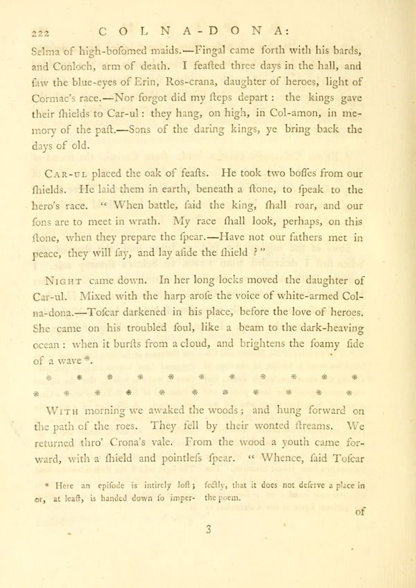 Display noteCol-amon of troubled streams, dark wanderer of distant vales, I behold thy course, between trees, near Car-ul's echoing halls. There dwelt bright Colna-dona, the daughter of the king. Her eyes were rolling stars; her arms were white as the foam of streams. Her breast rose slowly to sight, like ocean's heaving wave. Her soul was a stream of light.—Who, among the maids, was like the love of heroes?