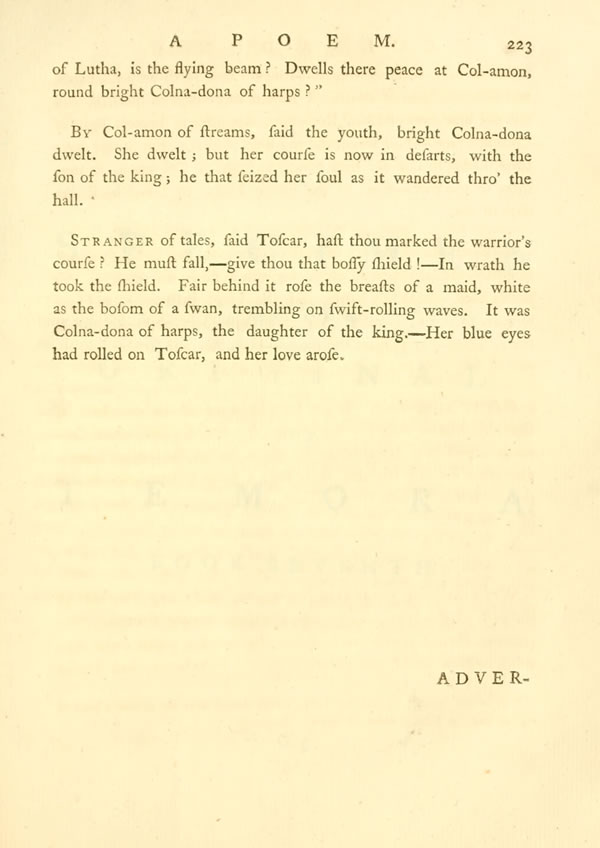 Stranger of tales, said Toscar, hast thou marked the warrior's course? He must fall,—give thou that bossy shield!—In wrath he took the shield. Fair behind it rose the breasts of a maid, white as the bosom of a swan, trembling on swift-rolling waves. It was Colna-dona of harps, the daughter of the king.—Her blue eyes had rolled on Toscar, and her love arose.