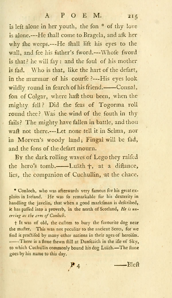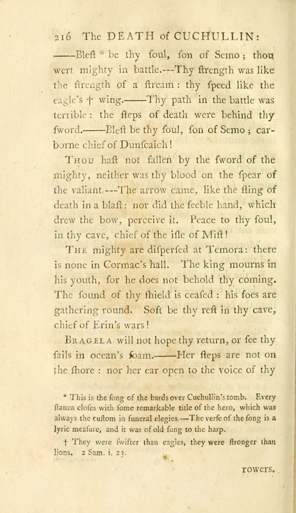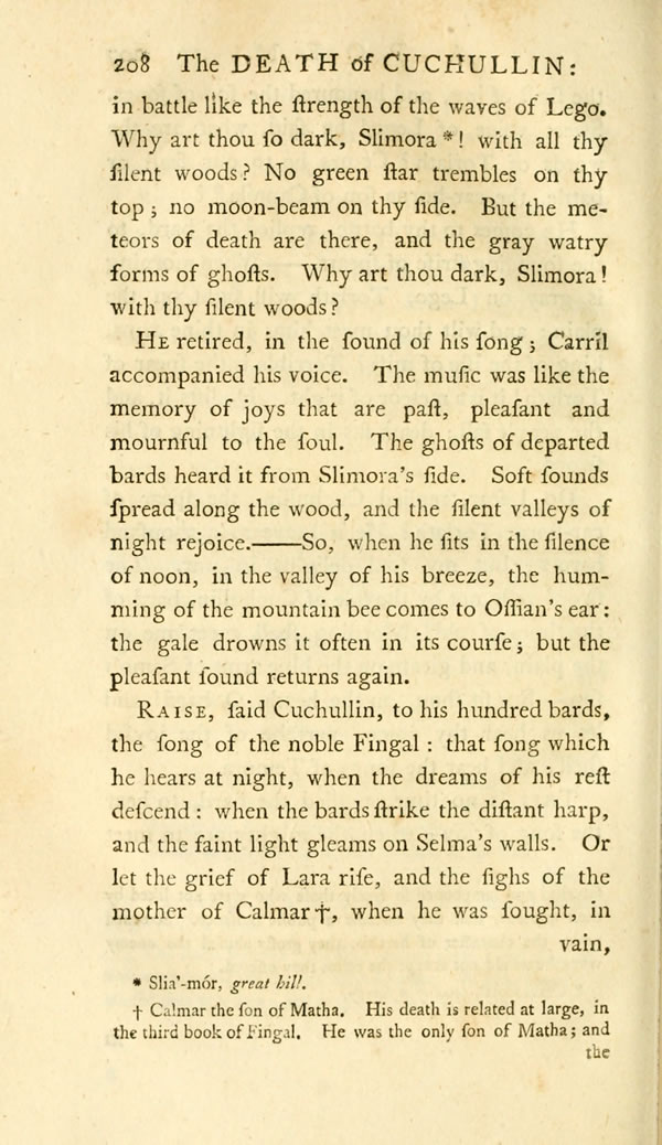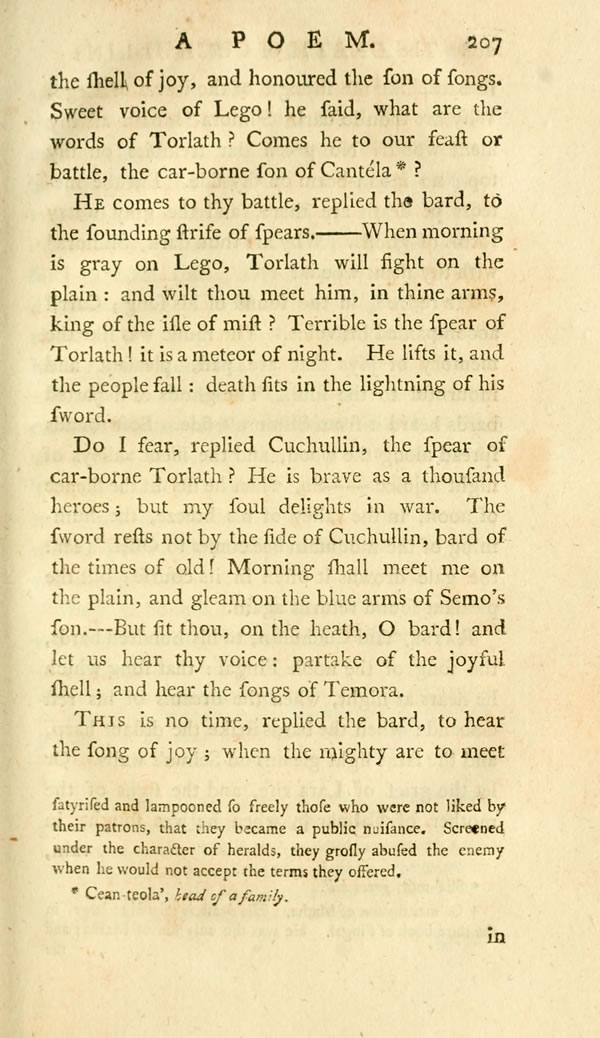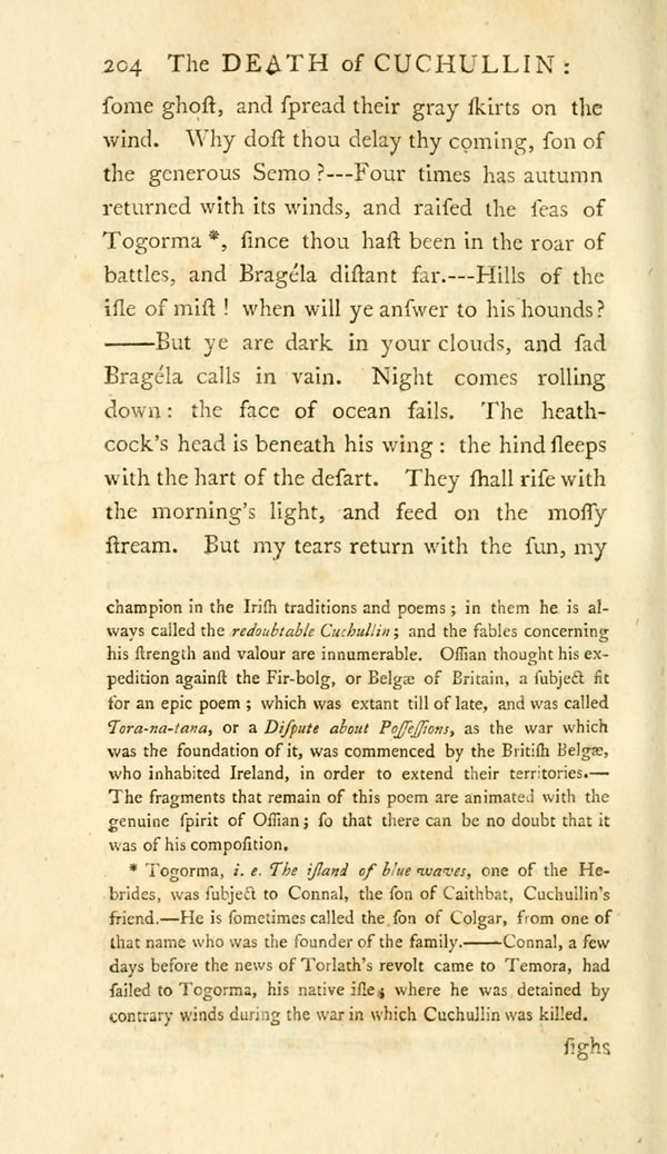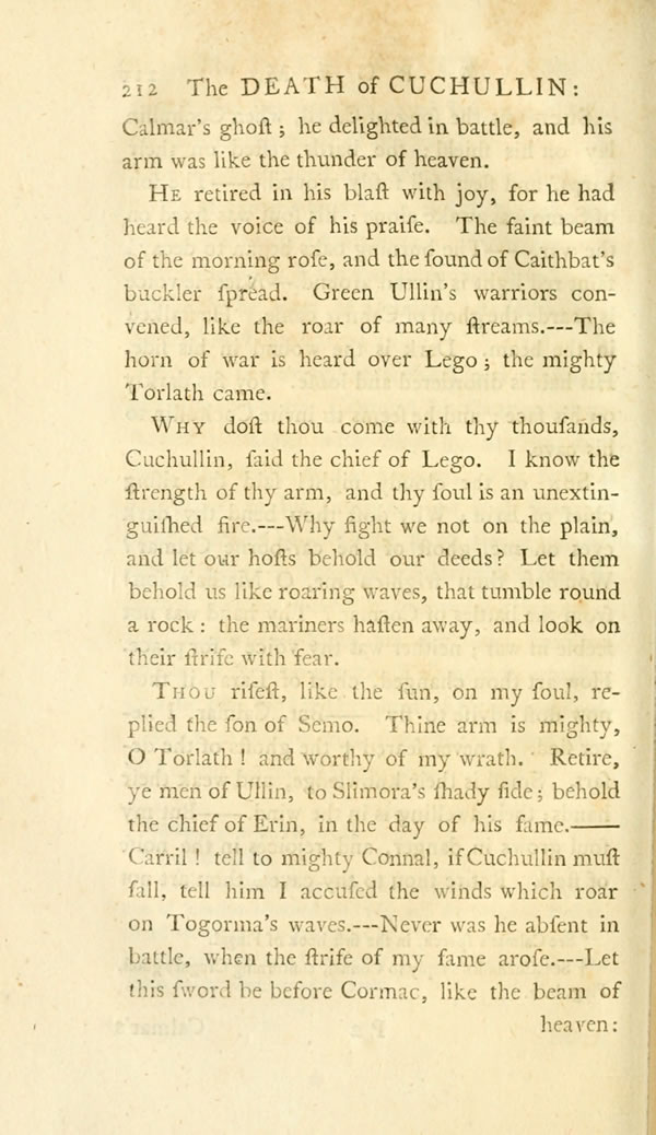 Do I fear, replied Cuchullin, the spear of car-borne Torlath? He is brave as a thousand heroes; but my soul delights in war. The sword rests not by the side of Cuchullin, bard of the times of old! Morning shall meet me on the plain, and gleam on the blue arms of Semo's son.—But sit thou, on the heath, O bard! and let us hear thy voice: partake of the joyful shell; and hear the songs of Temora.