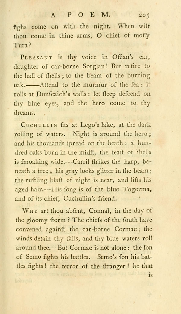 Pleasant is thy voice in Ossian's ear, daughter of car-borne Sorglan! But retire to the hall of shells; to the beam of the burning oak.——Attend to the murmur of the sea: it rolls at Dunscaich's walls: let sleep descend on thy blue eyes, and the hero come to thy dreams.
