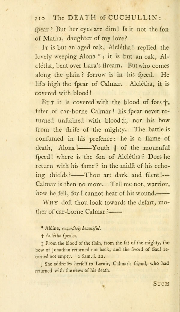 But it is covered with the blood of foesDisplay note, sister of car-borne Calmar! his spear never returned unstained with bloodDisplay note, nor his bow from the strife of the mighty. The battle is consumed in his presence: he is a flame of death, Alona!——YouthDisplay note of the mournful speed! where is the son of Alclétha? Does he return with his fame? in the midst of his echoing shields?——Thou art dark and silent!—Calmar is then no more. Tell me not, warrior, how he fell, for I cannot hear of his wound.——