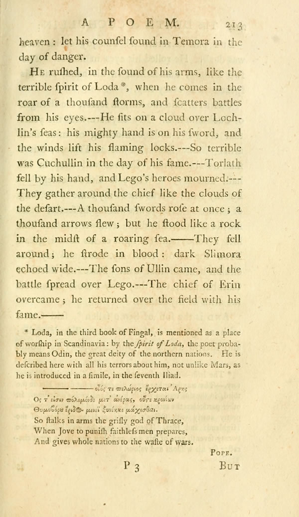 He rushed, in the sound of his arms, like the terrible spirit of LodaDisplay note, when he comes in the roar of a thousand storms, and scatters battles from his eyes.—He sits on a cloud over Lochlin's seas: his mighty hand is on his sword, and the winds lift his flaming locks.—So terrible was Cuchullin in the day of his fame.—Torlath fell by his hand, and Lego's heroes mourned.—They gather around the chief like the clouds of the desart.—A thousand swords rose at once; a thousand arrows flew; but he stood like a rock in the midst of a roaring sea.——They fell around; he strode in blood: dark Slimora echoed wide.—The sons of Ullin came, and the battle spread over Lego.—The chief of Erin overcame; he returned over the field with his fame.——