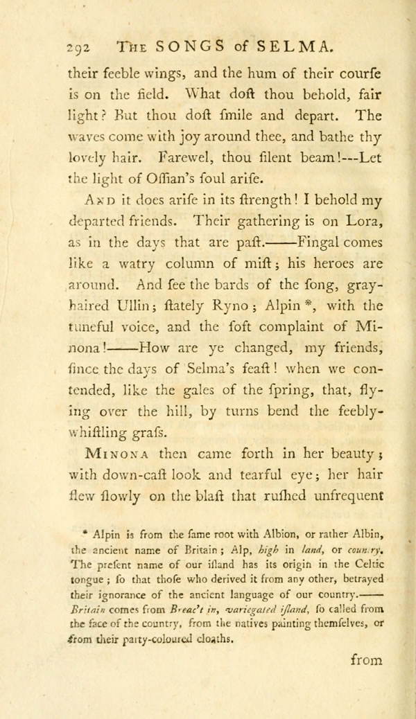 And it does arise in its strength! I behold my departed friends. Their gathering is on Lora, as in the days that are past.——Fingal comes like a watry column of mist; his heroes are around. And see the bards of the song, gray-haired Ullin; stately Ryno; AlpinDisplay note, with the tuneful voice, and the soft complaint of Minona!——How are ye changed, my friends, since the days of Selma's feast! when we contended, like the gales of the spring, that, flying over the hill, by turns bend the feebly-whistling grass.