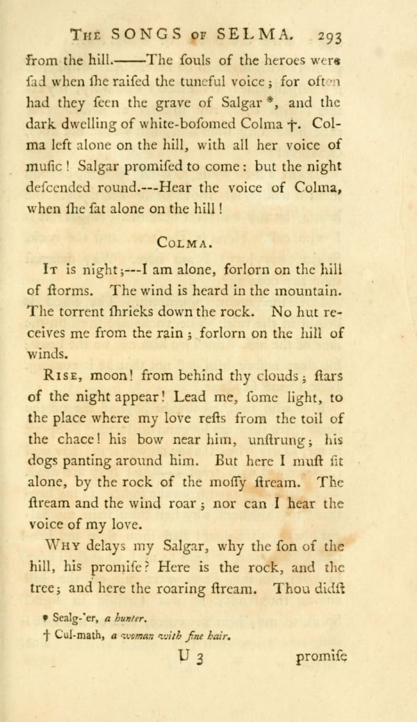 Cease a little while, O wind! stream, be thou silent a while! let my voice be heard over the heath; let my wanderer hear me. Salgar! it is I who call. Here is the tree, and the rock. Salgar, my love! I am here. Why delayest thou thy coming?