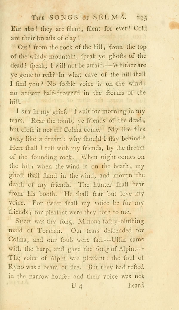 The wind and the rain are over: calm is the noon of day. The clouds are divided in heaven. Over the green hills flies the inconstant sun. Red through the stony vale comes down the stream of the hill. Sweet are thy murmurs, O stream! but more sweet is the voice I hear. It is the voice of Alpin, the son of the song, mourning for the dead. Bent is his head of age, and red his tearful eye. Alpin, thou son of the song, why alone on the silent hill? why complainest thou, as a blast in the wood; as a wave on the lonely shore?
