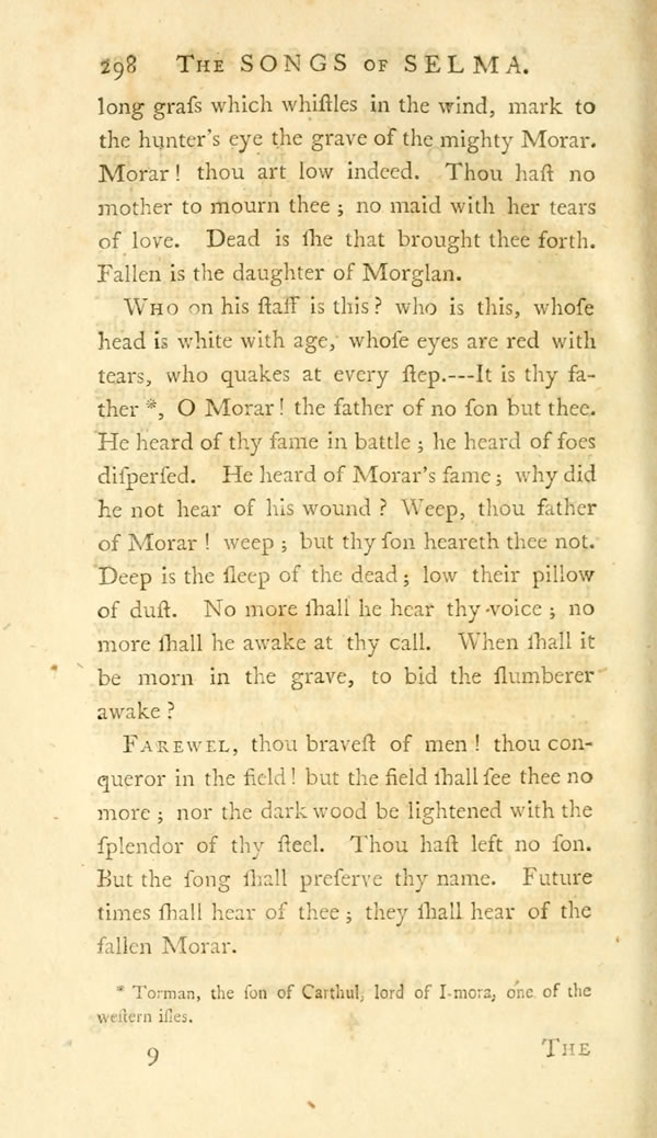Who on his staff is this? who is this, whose head is white with age, whose eyes are red with tears, who quakes at every step.—It is thy fatherDisplay note, O Morar! the father of no son but thee. He heard of thy fame in battle; he heard of foes dispersed. He heard of Morar's fame; why did he not hear of his wound? Weep, thou father of Morar! weep; but thy son heareth thee not. Deep is the sleep of the dead; low their pillow of dust. No more shall he hear thy voice; no more shall he awake at thy call. When shall it be morn in the grave, to bid the slumberer awake?