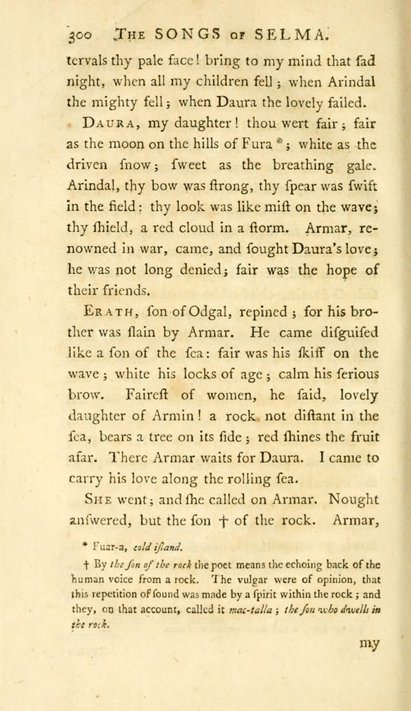 Daura, my daughter! thou wert fair; fair as the moon on the hills of FuraDisplay note; white as the driven snow; sweet as the breathing gale. Arindal, thy bow was strong, thy spear was swift in the field: thy look was like mist on the wave; thy shield, a red cloud in a storm. Armar, renowned in war, came, and fought Daura's love; he was not long denied; fair was the hope of their friends.