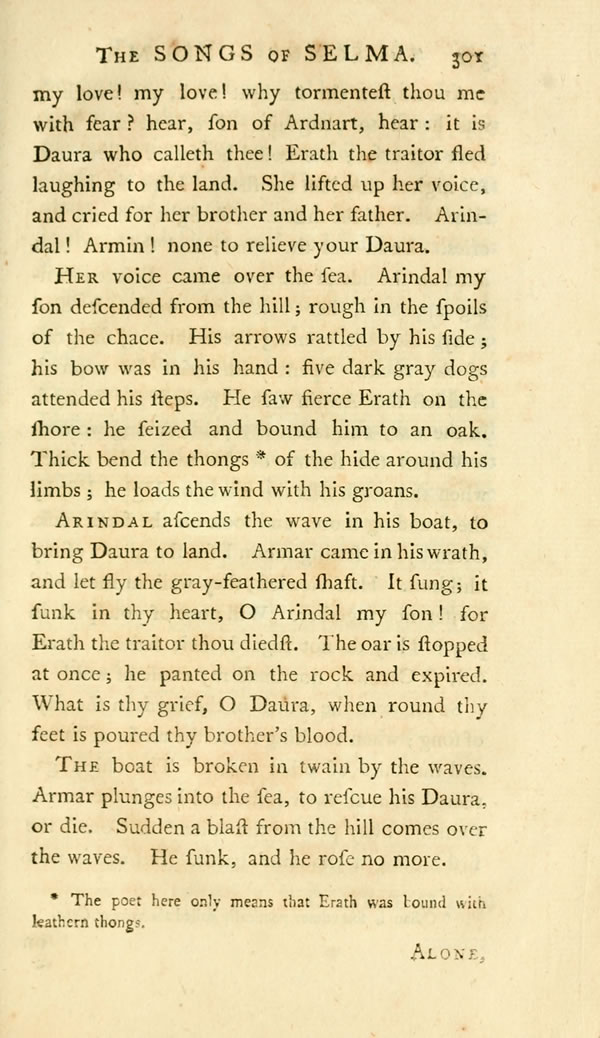 Arindal ascends the wave in his boat, to bring Daura to land. Armar came in his wrath, and let fly the gray-feathered shaft. It sung; it sunk in thy heart, O Arindal my son! for Erath the traitor thou diedst. The oar is stopped at once; he panted on the rock and expired. What is thy grief, O Daura, when round thy feet is poured thy brother's blood.